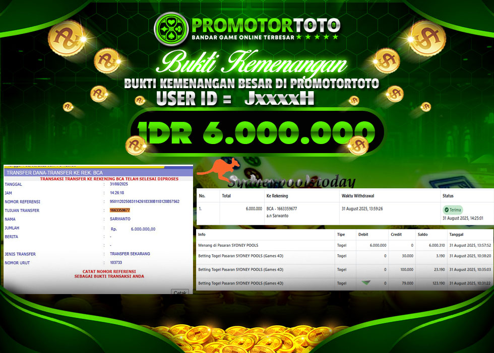 SELAMAT kepada Mr. J Telah menang dalam permainan SYDPOOLS Rp.6,000,000,- Setelah mengisi formulir withdraw dengan hanya dalam waktu 5 - 10 Menit langsung di transfer ke rekening yang terdaftar. Bukti pembayaran ini adalah bukti yang Valid dan dapat di Pertanggung Jawabkan.