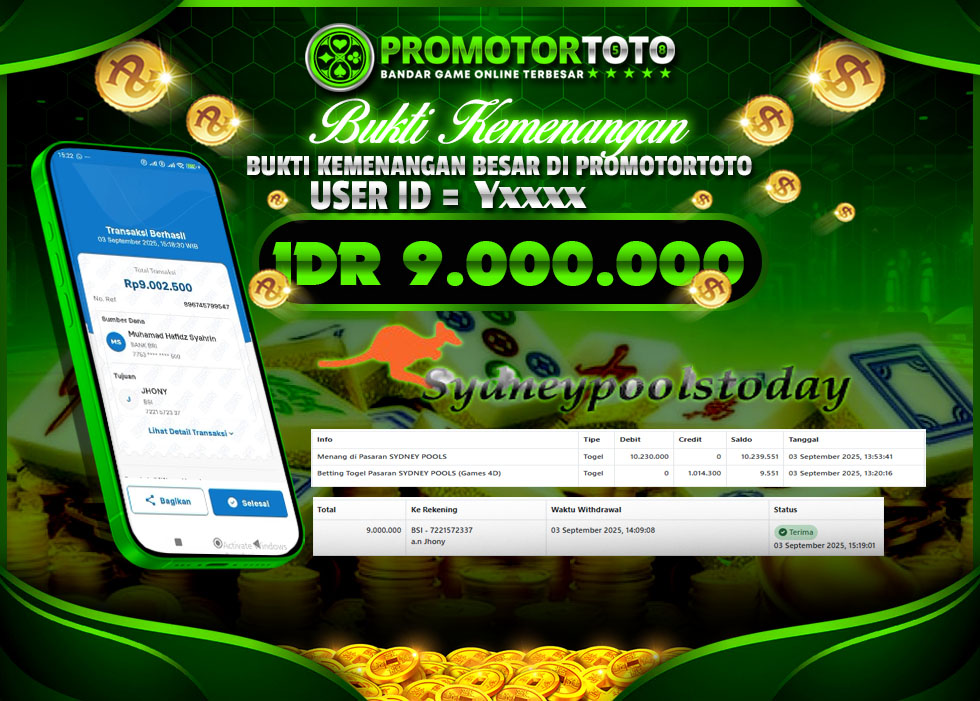 SELAMAT kepada Mr. Y Telah menang dalam permainan SYDPOOLS Rp.9,000,000,- Setelah mengisi formulir withdraw dengan hanya dalam waktu 5 - 10 Menit langsung di transfer ke rekening yang terdaftar. Bukti pembayaran ini adalah bukti yang Valid dan dapat di Pertanggung Jawabkan.