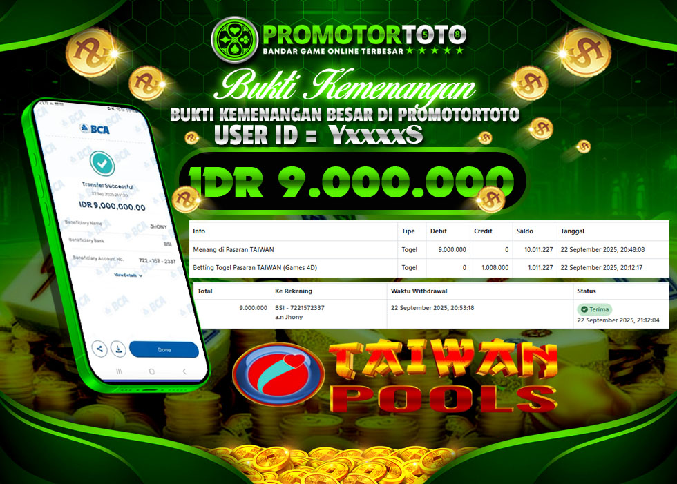 SELAMAT kepada Mr. Y Telah menang dalam permainan TAIWAN Rp.9,000,000,- Setelah mengisi formulir withdraw dengan hanya dalam waktu 5 - 10 Menit langsung di transfer ke rekening yang terdaftar. Bukti pembayaran ini adalah bukti yang Valid dan dapat di Pertanggung Jawabkan.